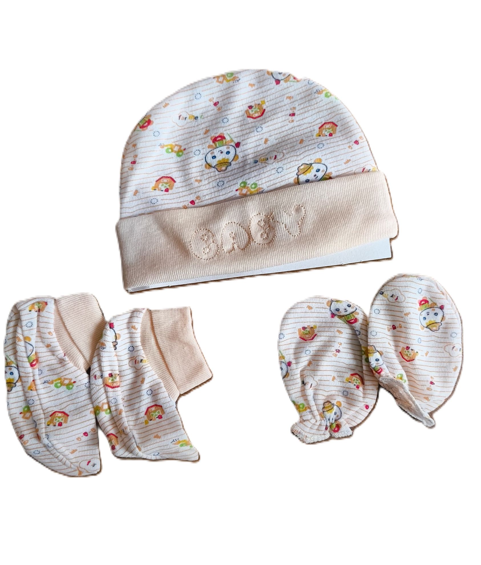 సాఫ్ట్ కాటన్ బేబీ క్యాప్, బూటీలు & మిట్టెన్స్ సెటు – అబ్బాయిలకు & అమ్మాయిలకు అనుకూలం